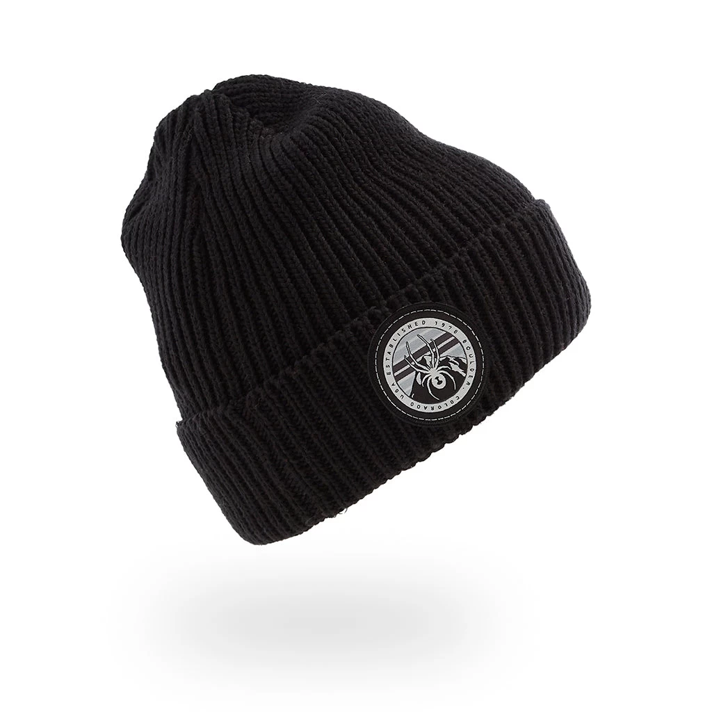 A custom Spyder mountain logo patch adorns this timeless cuffed beanie.